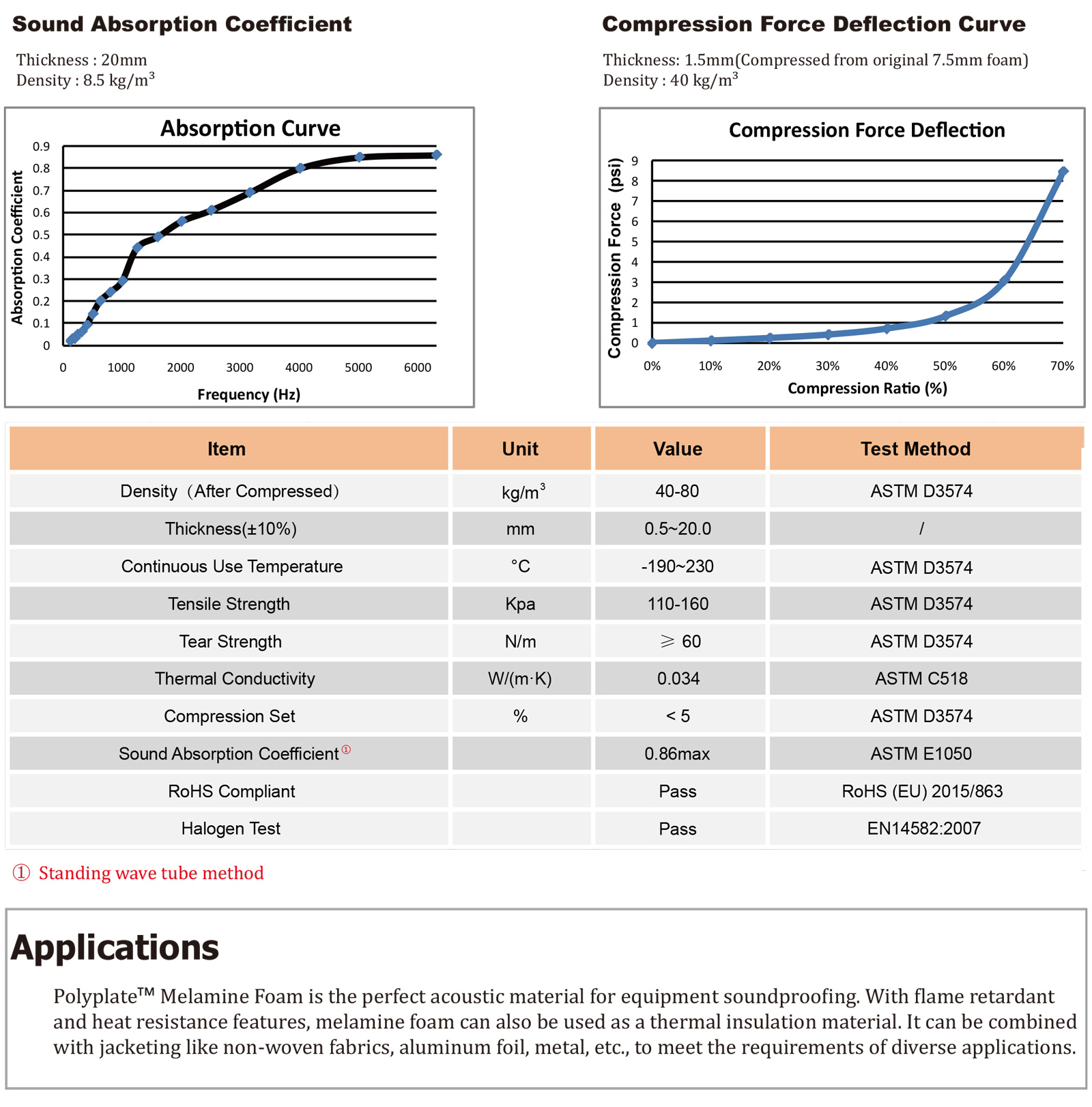 PolyplateTM 三聚氰胺泡棉是由三聚氰胺樹脂制成的熱固性聚合物。開孔具有三維網(wǎng)狀結構的特征。這種結構使得泡棉在阻擋噪聲和隔熱方面有效。三聚氰胺泡棉以三聚氰胺樹脂為原料,本身具有優(yōu)異的阻燃性能。三聚氰胺泡棉還具有優(yōu)異的耐溫性和熱穩(wěn)定性。它可以在極端溫度下保持其物理特性。在電子行業(yè),這種泡沫通常被壓縮到其原始厚度的15%-20%,以獲得最佳的吸聲效果。標準泡沫顏色為白色和灰色。其他顏色可根據(jù)要求提供。